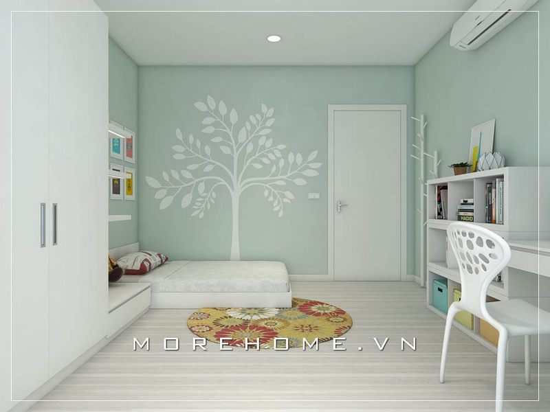 Phòng ngủ trẻ em được trang trí tinh tế bằng nội thất gỗ công nghiệp màu trắng, vách tường được làm đẹp bằng giấy dán tường màu xanh nhẹ tạo nên một điểm nhấn khó quên.